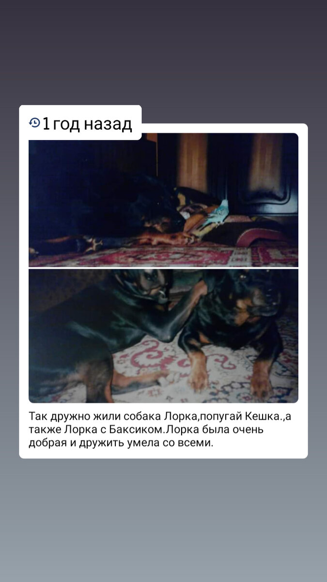 Дружба моих животных Кроме попугая Кешки в нашей семье жили ротвейлеры.На верхнем фото Кешка и Лорка -ротвейлер. Кешка подлетал к Лорке и хотел с не играть.То клюнет в попку,то к носу близко подлетит,но Лорка очень добрая девочка.Она н когда его не трогала,а только следила за ним.А я наблюдала эту картину.Очень забавно было смотреть на них.