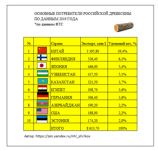 - Китай скупает огромное количество нашей древесины. В 2019 году мы продали им на 3 миллиарда 395 миллионов $. Что составляет 39,4% от общего объема. Достаточно внушительный процент.
