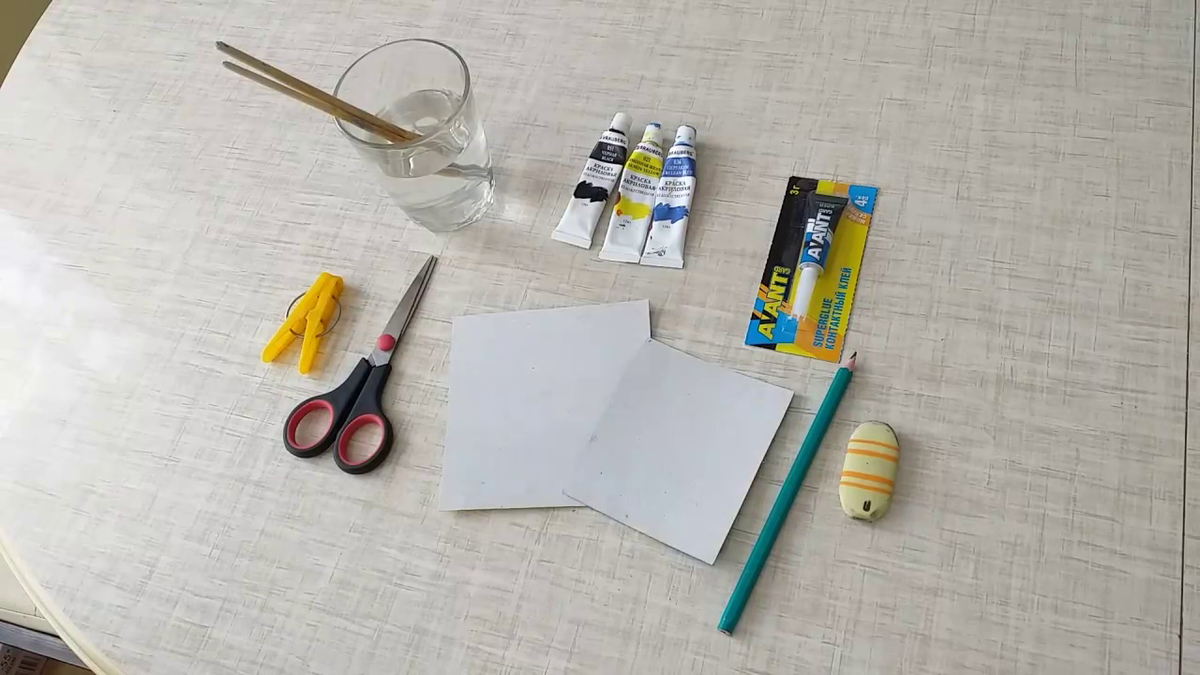 Для начала мы приготовим то из чего мы будем делать птенца. Нам нужны: ножницы,прищепка,2 квадратика из картона,карандаш с ластиком,супер клей,краски,вода и кисточки.
