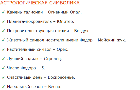 Мужское имя Федор корнями уходит в древнегреческую культуру. Произошло от древнего имени Теодорос, состоящего из двух слов. Первое – «теос», означающее «Божество» или «Бог». Второе – «дорон», в переводе с греческого «подарок» или «дар». Буквально его значение имеет трактовку «дарованный Богом». Сегодня теряет свою популярность, но по-прежнему встречается в русскоговорящих странах. Имя Федор обладает сильной символикой и особенным характером. Все Федоры одаренные, ответственные, внимательные, чистоплотные, самостоятельные и порядочные люди. Особенность их характера в том, что они любят одиночество. СМОТРИТЕ ВИДЕО - ПОДРОБНЕЕ ТУТ Источник - Значение имени Федор: карма, характер и судьба