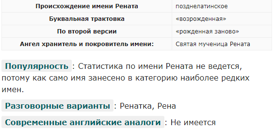Женское имя Рената имеет латинское происхождение. Является женской вариацией мужского имени Ренат. Имеет трактовку «рожденная заново» или же «возродившаяся». В наши дни пользуется достаточно высоким спросом на территории России и близлежащих стран. Имеет превосходную совместимость со многими мужскими русскими и заграничными именами. Значение имени и мощная энергетика сулят носительнице множество интересных качеств характера. Рената обычно, это рассудительная, планомерная, спокойная, честная, расчетливая, открытая, общительная, мечтательная и справедливая девушка. СМОТРИТЕ ВИДЕО - ПОДРОБНЕЕ ТУТ Источник - Значение имени Рената: карма, характер и судьба