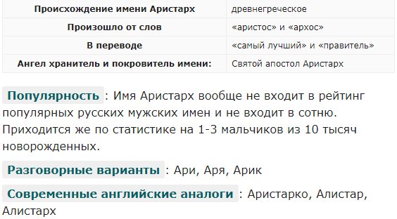 Мужское имя Аристарх по происхождению древнегреческое. Произошло от слияния древнегреческих слов «аристос» («самый лучший») и «архо» («правитель»). Трактуется как «предводитель лучших» или «наилучший правитель». В наше время популярностью не пользуется. Как правило, в носителе имени Аристарх проявляются такие качества как терпеливость, сила воли, усидчивость, уверенность в своих силах, властность, недоверчивость, стремительность, свободолюбие и честность. Аристархи недолюбливают грубиянов, слабых и безынициативных людей. Они не уважают корыстных и лицемерных людей. СМОТРИТЕ ВИДЕО - ПОДРОБНЕЕ ТУТ Источник - Значение имени Аристарх: карма, характер и судьба
