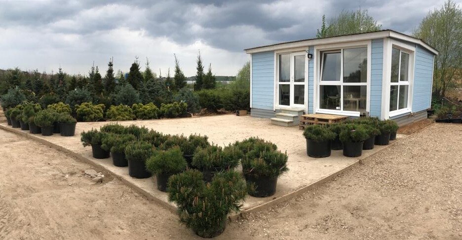 Дачный домик Панорамика состоит из светлой панорамной столовой (9м2), вместительной кухни-студии (4м2), просторной спальни (7м2) и совместного санузла (2м2).