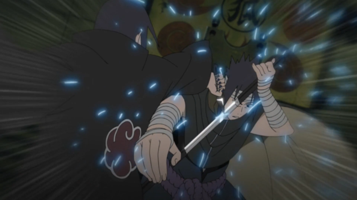 Саске крадёт накопленную Курамой для Наруто чакру и создает чидори, покрытый пламенем аматерасу. Наруто же берёт последнюю чакру Курамы и кастует расенган.