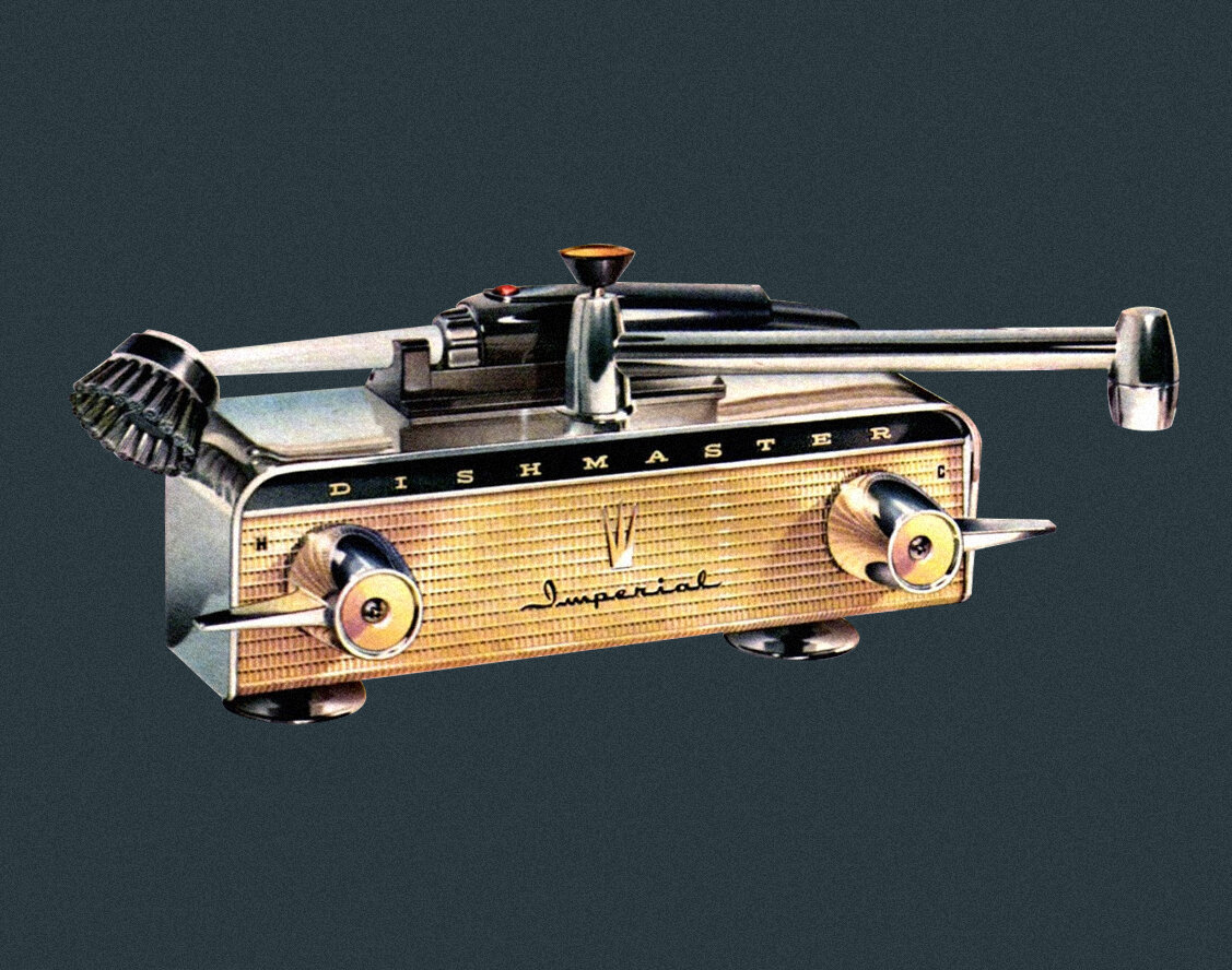 Этот ретро смеситель, который своим дизайном более походит на старый радиоприемник или Сadillac 60-х годов, был важным атрибутом для кухни мечты по-американски. Нам особенно сложно представить, что этот смеситель представляет из себя , ведь в истории советского союза и стран постсоветского пространства никогда не было ничего подобного. В послевоенное время (вторая мировая война) вся американская промышленность перевела вектор производства с боевых технологий на бытовые, а именно разработка полезных изобретений для дома. Тогда и появился Dishmaster - смеситель способный заменить посудомоечную машину. Для многих было накладно держать посудомоечную машину дома: высокая стоимость, дорогое обслуживание, большие счета за электроэнергию в воду. Dishmaster напоминал форму традиционного смесителя: он также имел кран и рукоятки регулирования подачи воды. Ключевой его особенностью являлась чистящая щетка с рукояткой, через которую выводился основной поток воды. Получался небольшой душ