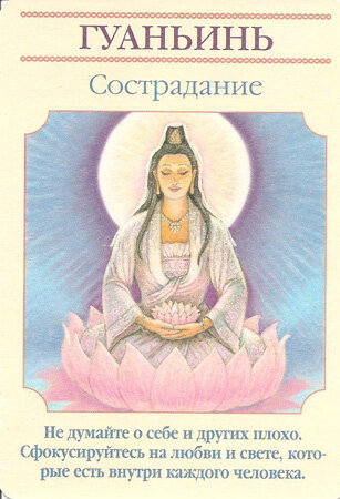 «Богиня дня» – онлайн гадание на оракуле богинь Дорин Верче позволит не только узнать, какая богиня будет сопровождать вас на протяжении дня, но и подскажет, какие ошибки по отношению к себе и окружающим вы, возможно, допускаете. Богини внимательно наблюдают за каждым из нас и всегда готовы прийти на помощь в трудную минуту. Поэтому, даже если у вас не очень хорошее настроение, или вы столкнулись с проблемами или сложностями, просто попросите Богинь поддержать вас и дать мудрый совет. Богиня, послание которой вы получите в результате этого гадания, будет на протяжении всего дня оберегать, помогать и защищать вас, а вы будете находиться под ее покровительством. Ваша Богиня Дня и ее послание для вас Сострадание. Не думайте о себе и других плохо. Сфокусируйтесь на любви и свете, которые есть внутри каждого человека. Гуаньинь – восточная богиня, которая слышит все молитвы и является квинтэссенцией чистоты. Значение карты: Поручите небесам исцеление и преобразование чувств вины и стыда. * С
