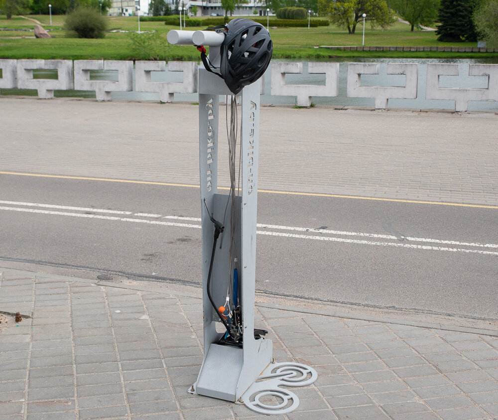 Велоинфраструктура Минска постоянно развивается. В прошлом году город наводнили желтые прокатные велосипеды Kolobike, которым изрядно досталось в первые месяцы эксплуатации. В этом году на главной минской велодорожке появилось пять пунктов самообслуживания велосипедов. В нетронутом виде они простояли недолго. Стойка с велоинструментом – веломаячок – весьма полезная штука для многих велосипедистов. Она позволяет сделать практически все виды регулировок и мелкий ремонт любого байка, включая накачку колес. С умелыми руками можно сделать и более серьезный ремонт, кроме снятия каретки, кассеты и правки ободов. Но разве может новая стойка с инструментом стоять просто так? Вандалов ждали, и они пришли. В мае Минское велосипедное общество (МВО) отрапортовало, что на двух стойках был украден инструмент (спицевой ключ и шестигранники). С этого момента историю вандализма маячков можно считать открытой. «Уходу» инструментов не помешали металлические тросики Стенд на дворце спорта разрисовали.