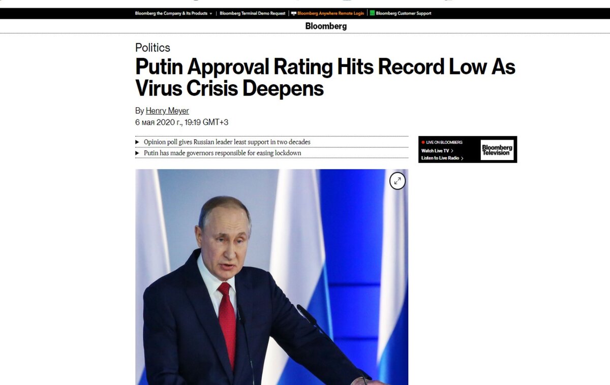 Уважаемые читатели, если кто-то не имел возможности ознакомиться с полным текстом так критикуемой сегодня статьи Bloomberg, содержащей данные о рейтинге президента Путина, привожу ниже свой перевод. Как вы считаете, мог рейтинг президента упасть на фоне пандемии, растущей безработицы и других текущих тенденций? В принципе, падение рейтинга логично. Могло ли оно произойти на 27%? Повлияет ли статья в Bloomberg на "дестабилизацию ситуации в России", как выразился Волошин? Ваше мнение? Привожу статью ниже полностью (она небольшая). "Рейтинг одобрения президента Владимира Путина упал до рекордно низкого уровня на фоне растущего экономического ущерба от пандемии коронавируса и резкого падения цен на нефть, которая является главным экспортным источником доходов России, показал опрос общественного мнения. Поддержка Путина упала до 59% в апреле с 63% месяцем ранее, что является худшим результатом с тех пор, как он пришел к власти в 2000 году, согласно опросу, опубликованному в среду независи