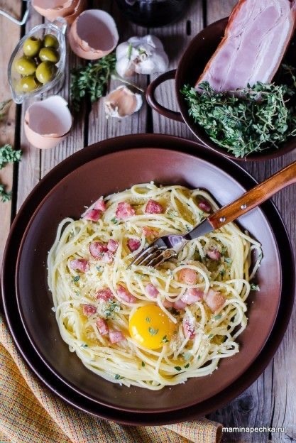 Ингредиенты: 1.Варим спагетти. 2.Обжариваем бекон с небольшим количеством масла, добавляем спагетти. 3.Желтки со сливками тщательно перемешиваем и вливаем в нашу пасту. 4.Перемешиваем все на низком огне, а потом на сильном огне мешаем ещё минутку. 5.Снимаем с огня и накрываем крышкой. 6.Натираем сыр и посыпаем им нашу карбонару. По желанию можно нарезать зелень и добавить ее в пасту. Ну вот и все, подаём к столу и наслаждаемся! Всем приятного аппетита😋