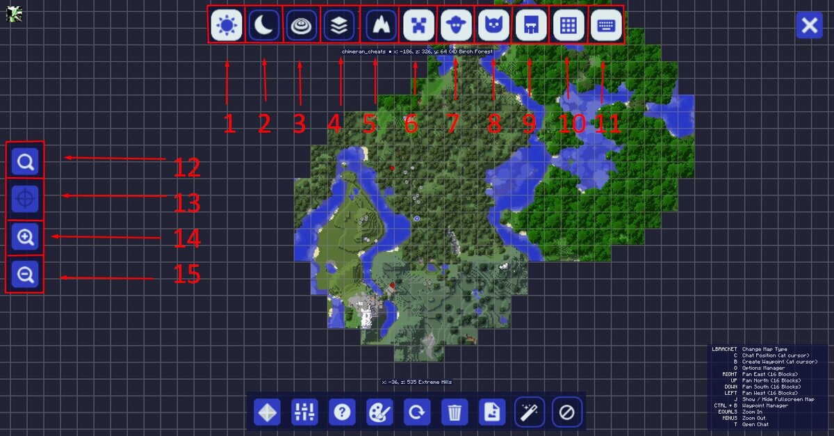 Journey Map — мод, который показывает карту вашего мира не только в игре, но и в браузере. Карта имеет очень гибкие настройки, от отображения на карте игрока и мобов до отображения различных пещер.Имеет настраиваемую миникарту, умеет сохранять фото карты, создавать метки, картографировать карту, а еще она полностью на русском языке. 1-2 Изображение: 1,2,3,4 - переключение режимов карты. 5,6,7,8,9 - показывать/не показывать мобов, пещеры на карте. 10 - убирает сетку с карты. 11 - убирает панель в нижнем правом углу. 12 - набираете координаты в выдвинутую панель, затем вас перекидывает на введенные координаты. 13 - при нажатии переносит камеру карты на местоположение персонажа. 14, 15 - приблизить/отдалить. 3-4 Изображение: Так же при двойном клике на карту, устанавливается waypoint(метка).
