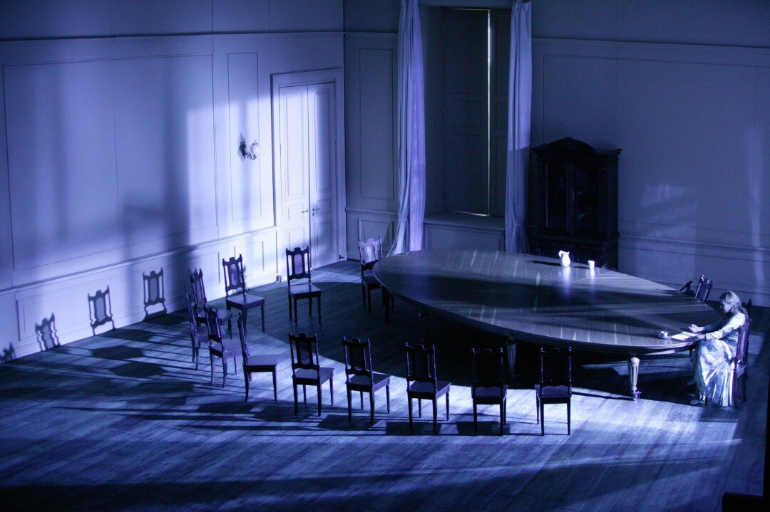 В спектакле всего две декорации: песочных тонов зала в доме Лариных для первых пяти картин (включая отповедь Онегина "в саду, в аллее" и сцену дуэли), и обитый ядовито-красным бархатом салон для двух петербургских. Надо отдать должное Чернякову, что дизайнер он превосходный - визуальный ряд выстроен со знанием дела. Также стоит отметить великолепную работу со светом, особенно удачную в сцене письма. Все действие разворачивается вокруг гигантского овального стола, который присутствует во всех семи картинах, перегораживая сцену от кулисы к кулисе - очевидный привет из постановки Станиславского 1922 года, которая не так давно еще шла в театре его имени. Наиболее удачной видится сцена письма Татьяны - при всех новаторских изысках она смотрится на одном дыхании и не идет поперек музыки. Здесь интересно выстроена тонко рассчитанная работа со светом, отражающая изменения в настроении героини, а настежь сами собой распахивающиеся окна в момент ее кульминации органично подчеркивают свежесть и силу нового чувства, охватившего Татьяну.
