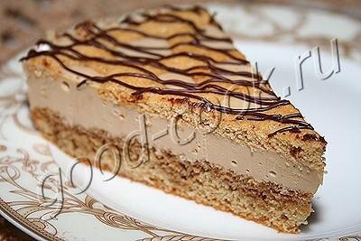 Торт умеренно сладкий. С сильным кофейным ароматом. Слой суфле плотный и мягкий. Корж хорошо пропитанный, но не распадающийся в кашу, а сохраняющий первоначальную фактуру. Категория: Торты, Муссовые торты, торты-суфле, Торты с творогом, Рецепты с творогом, Праздничные рецепты СОСТАВ КОРЖ 50г сливочного масла, 0,5 стакана сахара, 2 яйца, 1 ч ложка разрыхлителя, 3/4 стакана муки (120г), 1 ч ложка растворимого кофе, ванилин, щепотка соли ТВОРОЖНО-КОФЕЙНОЕ СУФЛЕ 2 ч ложки растворимого кофе, 200г 33~35% сливок, 10г желатина, 200г творога, 300г сгущённого молока ПРОПИТКА 100г воды, 0,5 ч ложки растворимого кофе, 20~30г сгущённого молока посмотреть калорийность» Тесто
