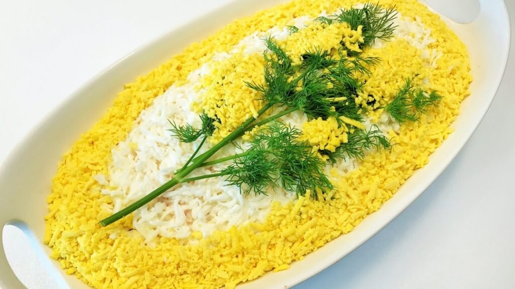 10. Теперь отделить белки от желтков и на терке натереть белки и выложить следующим слоем и тоже промазать майонезом.