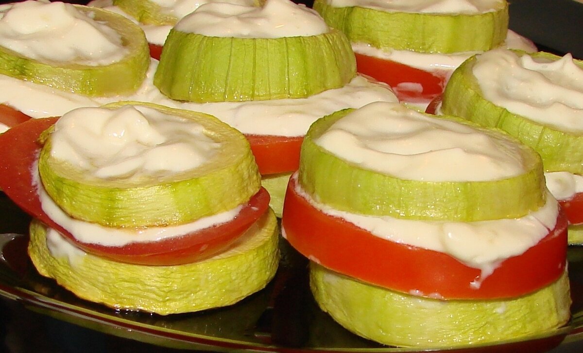 Такая закуска очень выручает, если нужно накрыть стол на праздник, а времени и желания стоять у плиты особенно нет. Готовится она легко и быстро и всего из четырех продуктов. Вам понадобится пара кабачков (молоденьких, с маленькими семечками), два помидора среднего размера, немного майонеза и 2-3 дольки чеснока. Кабачки моем, при желании чистим и режем кружочками толщиной около 1 см. Выкладываем на смазанный маслом противень и ставим на полчаса в духовку, разогретую до температуры 180 градусов. Пока овощи запекаются, моем и режем помидоры. Тоже кружочками, но более тонкими: толщиной около 5 мм. Чеснок пропускаем через пресс. Кладем в пиалку и смешиваем с майонезом. Заправка для будущей закуски из кабачков готова. Далее все очень просто. Вынимаем кабачки из духовки. Берем один кружочек и сверху смазываем его чесночной заправкой. Потом сверху кладем помидор. Тоже смазываем майонезом с чесноком. Накрываем сверху кабачком. И снова смазываем майонезом. Так поступаем со всеми овощными кружоч