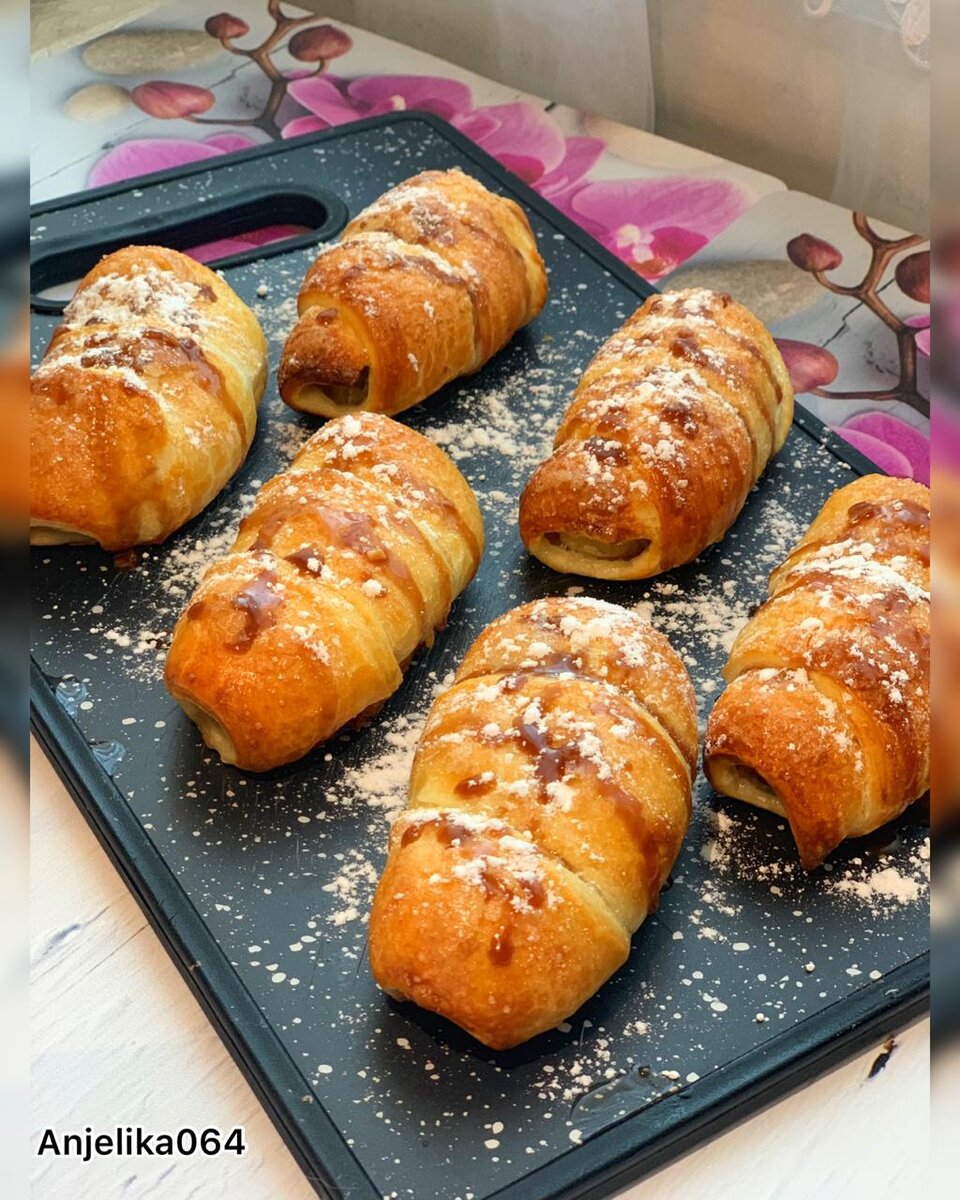 Невероятные слойки из слоеного теста с нежной банановой начинкой. Минимум ингредиентов и вашего времени. Ингредиенты: Слоёное тесто: Слоёное тесто способ приготовления: Муку предварительно нужно просеять. В отдельную посуду влить ледяную воду. Добавить уксус. Добавить соль и яйцо. Все хорошенько перемешать. Затем соединить жидкую смесь с просеянной мукой и замесить тесто. По консистенции тесто не должно быть сильно тугим, а наоборот эластичное, мягкое и не липнущее к рукам. Выложить тесто на присыпанный мукой стол и разделить на две одинаковые части. Раскатать первую часть как можно тоньше, толщина теста должна быть около 3-5 мм. Мягкое сливочное масло разделить пополам. Одну половину выложить на раскатанное тесто и намазать им обильно пласт теста. Затем вторую часть теста раскатать как и первую, как можно тоньше. Уложить поверх первой раскатанной части, чтобы края совпали, и обильно смазать вторую часть теста сливочным маслом. Свернуть слои теста в плотный рулет. Затем свернуть рул