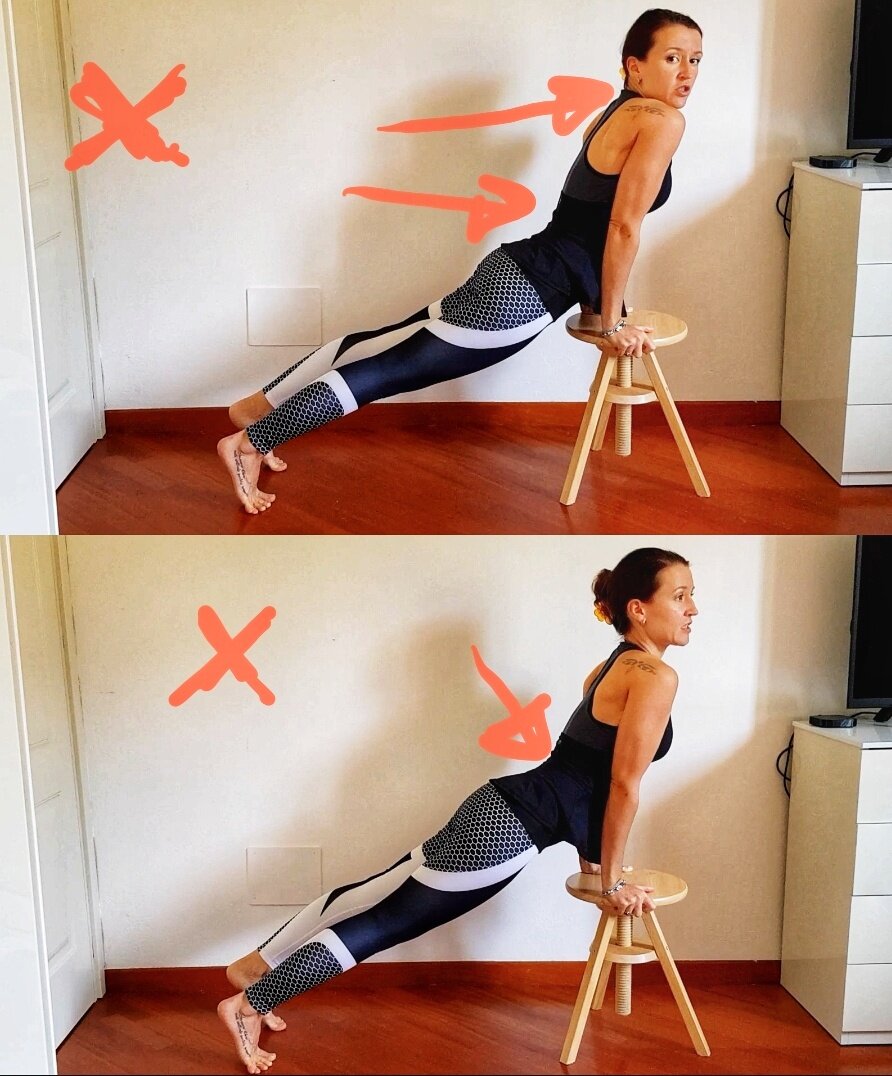 Итак, Вам понадобится обычный стул или стул с подлокотниками. Главное, чтобы была твёрдая опора. Захватываем сиденье стула с двух сторон и разворачиваем руки изнутри наружу так, чтобы внутренние стороны локтей смотрели вперёд. Расстояние между стопами и стулом Вы сможете понять опытным путём. Сначала отводим таз назад и вытягиваем спину в вариации «Собаки мордой вниз», о которой я подробно рассказала в предыдущем видео. Вы можете посмотреть его тут. Затем начинаем двигаться вперёд. Сразу подтяните мышцы живота, напрягите мышцы ног и опускайте таз, не прогибаясь в пояснице. Ладони должны оказаться либо под плечами, либо — лучше — даже немного позади. Это даст возможность хорошо оттолкнуться руками, раскрыть грудь и направить плечи вниз.