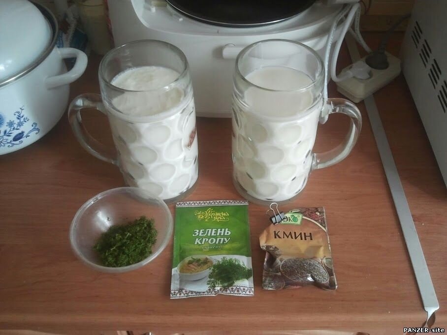 Я уже как-то выкладывал рецепт литовского сыра «Дайнава», но он немного другой, этот рецепт и проще, и несколько другого применения, так можно сказать. Но вся прелесть этого рецепта, если так можно сказать, в том, что продукты для него все вполне доступны для любого. Почти. В них нет ничего сложного, потому что это молоко и простокваша. Единственно, и то и другое домашнее, не магазинное. Итак, нам нужно взять по литру молока и простокваши (как раз пригодились литровый пивные кружки); зелень укропа, свежую или сушеную; тмин; соль; соду. Готовить сыр будем на водяной бане. Для этого в кастрюлю с кипятком ставим миску чуть большего диаметра и вливаем в нее молоко. Нагреваем его и вливаем туда же простоквашу. Растапливаем творог, пост
