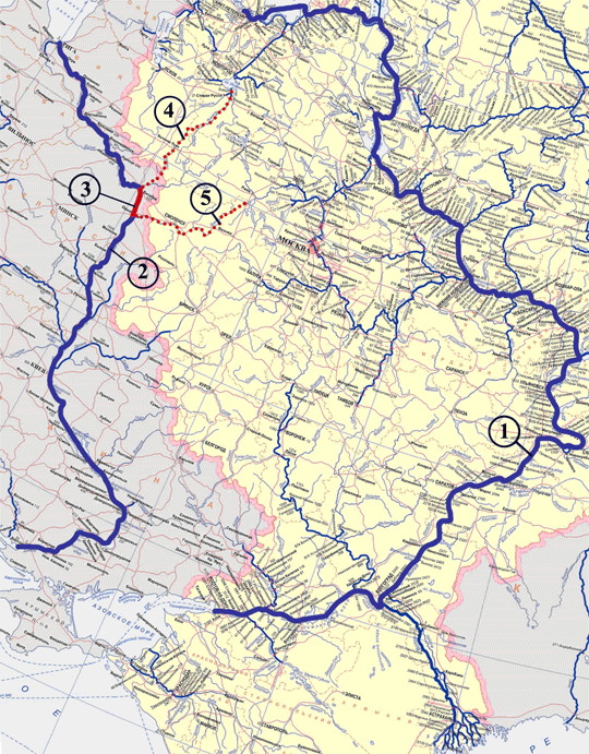 1 - воднотранспортный коридор «Север-Юг»; 2 - водный путь «Западная Двина-Днепр»; 3 - водораздельный участок пути; 4,5 - варианты соединения водного пути «Западная Двина-Днепр» с Невой и Волгой.