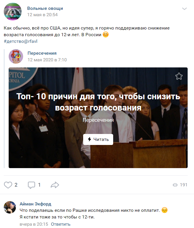 Отсюда проистекает следующий вопрос: а что это за работа? Речь идет о труде, который может обеспечивать хотя бы его самого, или это подработки, чтобы было на что развлечься с друзьями? Как-то восьмичасовой рабочий день плохо сочетается с необходимостью учиться. Допускаю, что есть дети, которые действительно могут или вынуждены сочетать учебу и работу (например из-за тяжелой жизни), но сколько их, да и разве именно они достаточно хорошо разберутся в политических нюансах? А как волонтерство, скажем, по защите китов должно добавлять им политического веса? Тоже непонятно.