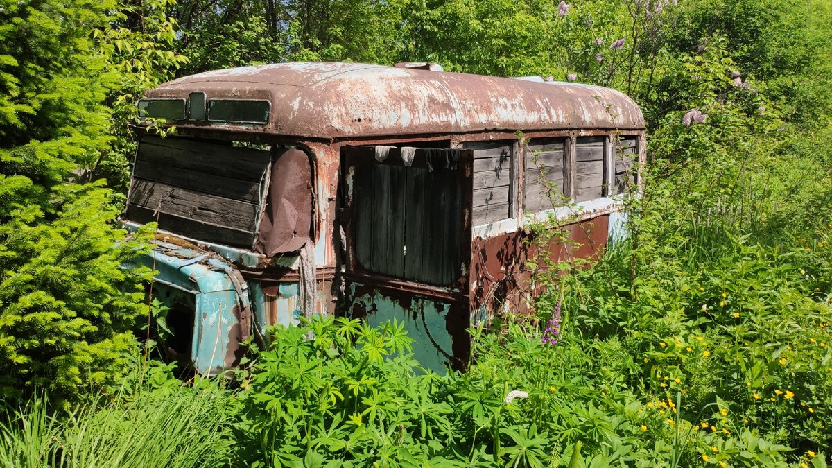 Очень старый автобус стоит на дачном участке. Как он туда попал? И зачем он там? На некоторые вопросы нет ответа, однако небольшую историю я знаю. С самого моего детства помню этого красавца, да, сейчас он переживает не очень хорошие времена, краска облупилась ещё больше, да и просел сильно. Но сколько помню себя, столько помню его. Не буду умничать и пытаться угадать что это за автобус, ибо не разбираюсь в этом. Однако знаю точно, что это был один из служебных. Почему? В окне была табличка "служебный". Элементарно. Но как он попал на участок? По рассказам родителей, он стоял там очень давно, ещё до того как приобрели участок (точно раньше 90-ых). Из слов: "стоял посреди поля". Тогда же решили сразу перенести его чуть ближе к краю, а именно к забору, и оборудовали в нём небольшую бытовку, в том числе первое время в нём спали. Сейчас об этом напоминает 2 кровати внутри. Тогда и окна были все забиты, и выглядел уютно, но до сих пор не понимаю, как там можно было спать? В детстве часто л