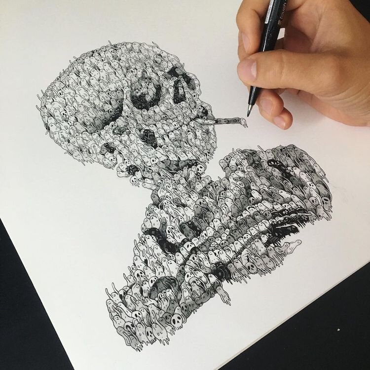 Если наблюдать за произведением искусства, то можно найти детали, которые были не заметны сначала. Если внимательно посмотреть на иллюстрации художника Ричарда Бернера, то можно обнаружить десятки, если не сотни тысяч маленьких "сюрпризов". Британский художник создает причудливые и замысловатые рисунки, собирая вместе множество крошечных людей. Они почти похожи на крошечные потерянные души, кричащие в эфир. Бернер изучал искусство в Брайтоне, где он впервые увлекся своими крошечными фигурками, похожими на призраков. Хотя он с любовью называет их «чемпионами», их называют множеством других имен, включая «потерянные души» и «лемминги». Бернер использует эти выразительные символы для создания других предметов, таких как черепа, цветы и даже сложные скульптуры. "Приведения" основаны на упрощенной человеческой форме и переданы с выразительной, минимальной линейной работой. Хотя они размещаются в больших группах, чтобы создать завораживающий узор, каждый из них совершенно уникален от