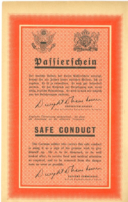 «Немецкий солдат, имеющий этот безопасный пропуск, использует его как знак своего искреннего желания сдаться. Он не должен иметь при себе оружия для того, чтобы о нем хорошо заботились, чтобы получать пищу и медицинскую помощь по мере необходимости, а также для удаления из опасной зоны как можно скорее.»