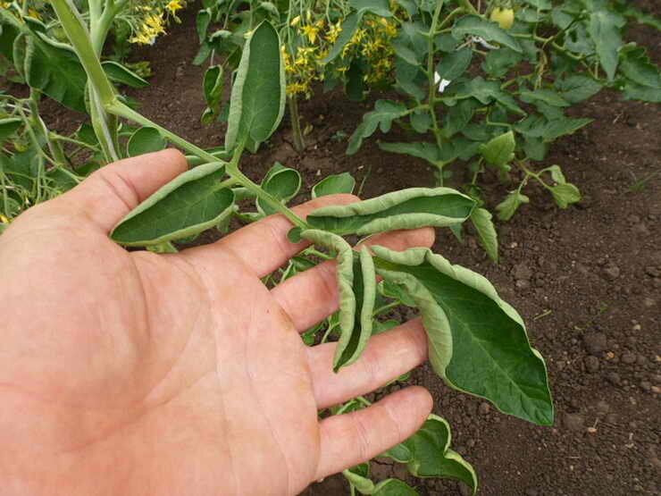 Скрученные верхние листики говорят о нарушении баланса важных микро- и макроэлементов или по причине нехватке влаги. В последнем случае растения просто экономят питание, это длится ровно до той поры, пока график и объем поливов не станут соответствующими. А вот баланс помогают восстановить сезонные удобрения, вносимые в зависимости от стадии развития культур.