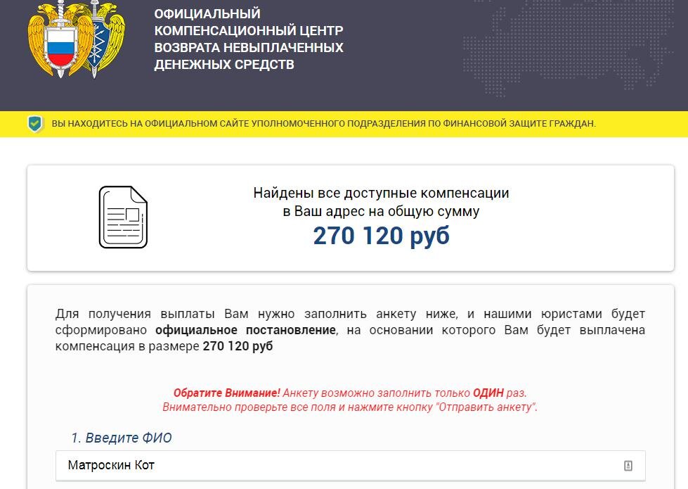 Просматривал сейчас спам на предмет попадания туда нужных писем. Был просто вал писем от "Компенсационных центров", в которых сообщалось, что государство просто мечтает выплатить всем гражданам от 12 000 до 500 000 рублей. Я сразу знал, что это мошенники, но мне стало любопытно: хоть что-то поменялось в этой схеме или нет? Первые такие "компенсационные центры", "европейские банки компенсаций" и прочее подобное фуфло мне попадались еще в 2009 году. Схема до сих пор не поменялась ни на грош и, по всей видимости, работает. Решил проверить, сколько государство задолжало Коту Матроскину. Оказалось, аж 270 120 рублей. Ну, что ж, повезло мохнатому - купит новый дом в Простоквашино :-)))) Для многих может показать это фуфло убедительным - вроде как процесс поиска идет около 2 минут, находит какие-то суммы и внизу страницы бегут "отзывы от получивших" и "вопросы от интересующихся". P.S.: Я специально не привожу адреса этих мошеннических сайтов и не собираюсь.