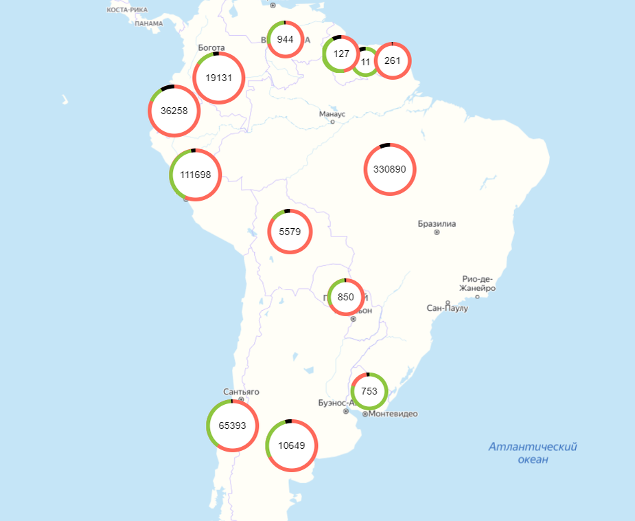 Четвертый день количество новых случаев заражения в мире превышает 100 000 человек в сутки. Несмотря на это летальность в мире снижается постепенно и составляет 6,27%. По макрорегионам мира наблюдается рост новых случаев заражения коронавирусом в Южной Америке, Западной Азии, Африке, Центральной Америке и Центральной Азии. В Западной и Восточной Европе наблюдается снижение. В Восточной Европе почти все вылечились. По итогам за 24.05 Бразилия догнала США по количеству новых случаев заражения коронавирусом и вышла не первое место в мире по количеству случаев смерти в сутки. Так же стоит отметить что в десятку стран по количеству новых случаев вышли Индия, Чили, Мексика, Перу. Подробную статистику по Бразилии смотрите здесь Подобную карту и статистику по России смотрите здесь, по Европе здесь, по США здесь. Список карт и статистика по ВСЕМ странам здесь. В Иране вторая волна распространения коронавируса. Читайте здесь Индия - новый очаг заражения коронавирусом в мире. Читайте здесь В как