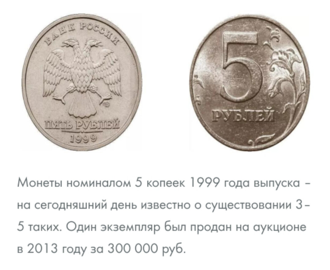 Привет! Сегодня хочу рассказать о самых дорогих монетах, которые могут оказаться у каждого в кошельке и копилке, только об этом вы можете не знать! Первая, очень дорогостоящая монета, это пятерка 1999 года выпуска, стоимость такой, одной монеты составляет примерно 300.000 тысяч рублей! Вторая менее дорогая, но однако чаще встречаемая пятерка 2006 года, стоимость которой составляет около 200.000 тысяч рублей! Третья монета, это 5 копеек, почти у каждого дома можно найти целую горсть монеток номиналом 5 копеек, у меня у самого их очень много, а вот такая монетка 1999 года стоит целых 250.000 рублей, посмотрите может вам улыбнется удача и вы найдете у себя дома именно такую монету!
