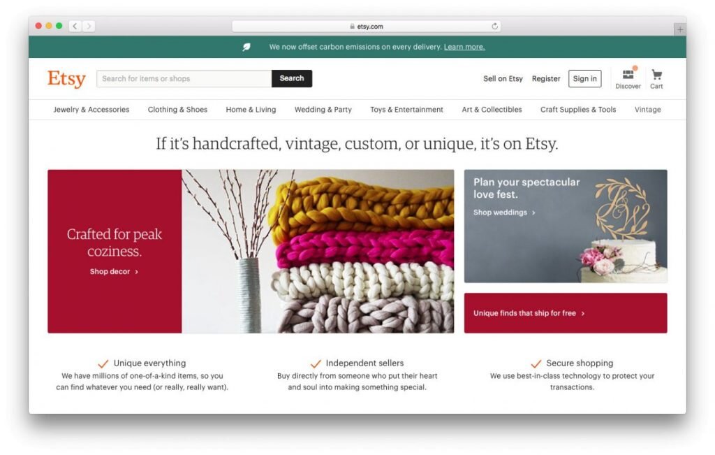Etsy является одним из лучших примеров. Это интернет-магазин, где представлены изделия ручной работы, такие как украшения и игрушки.