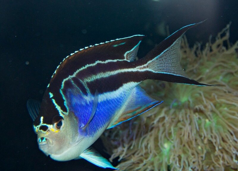Один из самых редких видов морского аквариума – хирург голубой королевский – стал необычайно популярным после выхода мультфильма «В поисках Немо». У этих рыб сжатое с боков тело, длинные плавники и отвесно спадающий лоб. Голубой окрас с черными завихрениями на теле, а также яркий желтый акцент плавника придают королевскому хирургу потрясающий внешний вид. Королевские голубые хирурги отлично уживаются с аквариумными рыбками любых видов, но не со своими сородичами. Просто эти рыбы – одиночки, и создают гаремные стайки исключительно на период спаривания. У королевских хирургов имеются острые, скальпелевидные шипы, которые могут выдвигаться и убираться. При наличии в аквариуме более одной рыбы шипы превращаются в эффективное оружие в спорах за территорию.