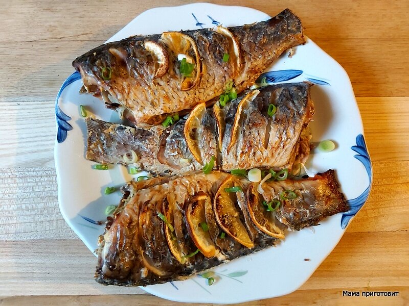 Люблю такие рецепты - убрал в духовку и забыл! Здравствуйте, друзья! Сегодня запекаем рыбу в духовке - очень вкусный и простой рецепт. Для детей обычно беру морскую рыбу, чтобы не беспокоиться по поводу костей, но иногда.... иногда позволяю себе покупать рыбу, которую люблю сама. Именно поэтому у нас сегодня речная рыба, а точнее карп, которого мы без труда приготовим, ведь мы будем его запекать. Вообще, рецепты с духовкой мои самые любимые. Задал температуру и время и занялся своими делами - милое дело) Итак, приступим! СОСТАВ: ПОШАГОВЫЙ ФОТО РЕЦЕПТ: Делаем надрезы на рыбе с двух сторон - это даст возможность карпу лучше промариноваться. Лимон разрезаем пополам, а затем нарезаем тонкими дольками. Лук нарезаем полукольцами. Чеснок трём на тёрке и измельчаем ножом. Конечно, можно использовать чеснокодавку, но я люблю такой способ. Мелко нарезаем укроп. Смешиваем в тарелке лук, чеснок и укроп. Добавляем немного лимона нарезанного кубиками. Рыбу натираем солью с двух сторон и внутри, т