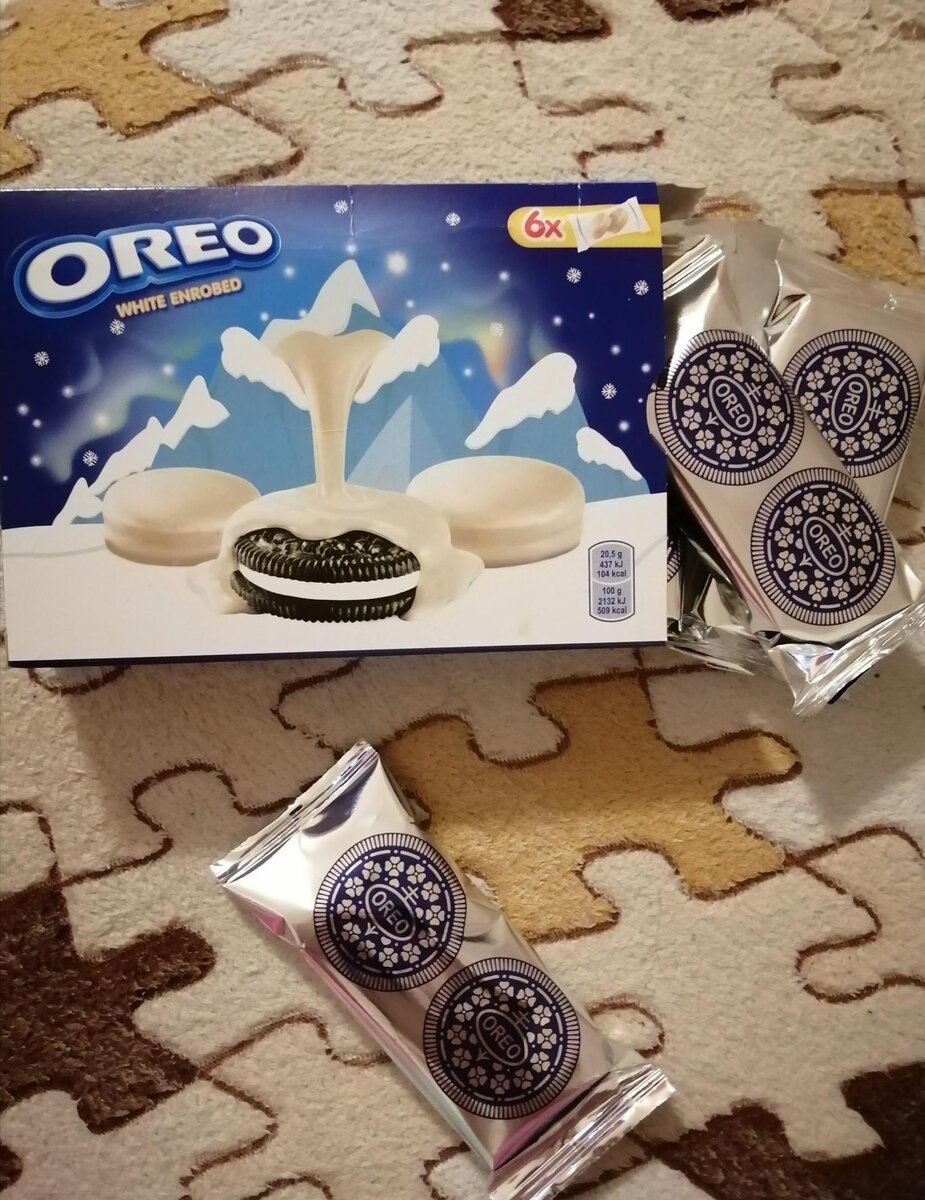 Доброго времени суток и спасибо, что зашли прочитать отзыв. Насмотрелась я на всякие отзывы о вкусняшках и решила побаловать себя печеньем Oreo White Enrobed. Зашла в Перекрёсток, увидела неплохую скидку, больше чем 50% и взяла. Я взяла с белой глазурью, там было ещё с тёмной, думаю по вкусу они отличаются, надо будет попробовать. В пачке находится 6 мини-пакетиков. В каждом лежит 2 печеньки. Вес печенья в целом составляет 246 грамм. Обычное печенье Oreo покрытое белой глазурью с ванильным вкусом. Вкусно, самое то под чай. Глазурь похожа немного на белый шоколад, печенье мягкое. Глазурь тает во рту. Внутри самого печенья стандартная начинка как и всегда. Очень часто встречала такие же печенья в глазури, но с другими начинаками, а это обычная сливочная классика.