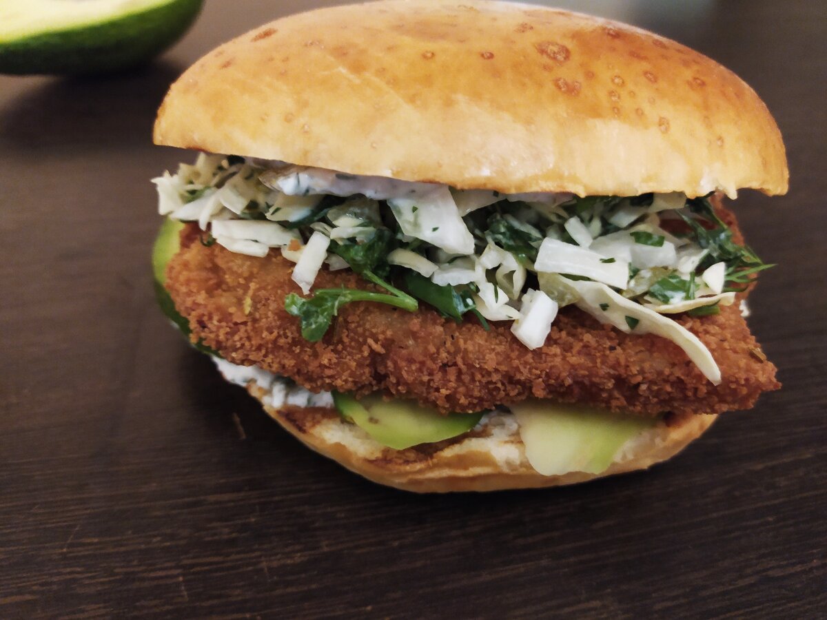 Хрустящая рыба, салат из капусты и соус тар-тар на греческом йогурте На 3 сэндвича 3 булочки для сэндвичей 450 гр. белой рыбы (камбала, телапия, треска) панировочные сухари 1 ч.л. семян фенхеля соль мука 2 яйца Соус тар-тар 230 гр. греческого йогурта 1,5 ч.л. яблочного уксуса 1 ст.л. каперсов 4 шт. небольших маринованных огурцов цедра лимона 1 ч.л. лимонного сока 1/4 пучка укропа Салат из капусты 1/2 маленького кочана капусты 1/4 пучка зеленого лука 1/4 пучка укропа 1/4 пучка петрушки авокадо По традиции начинаем с соуса. Смешиваем греческий йогурт, мелко нарезанные каперсы, мелко нарезанные маринованные огурцы мелко нарезанную зелень, лимонный сок, хорошо перемешиваем и убираем в холодильник минимум на 1 час. Когда соус постоял в холодильнике, готовим салат. Капусту, зеленый лук и зелень мелко режем. Добавляем 2-3 ст.л. соуса, перемешиваем. Приступаем к рыбе. Панировочные сухари венчиком смешиваем с семенами фенхеля и солью. Рыбу нарезаем. Окунаем сначала в яйцо, затем в мук