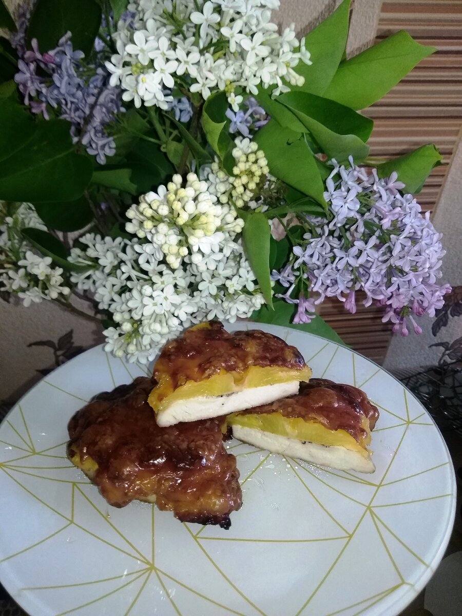 Нам понадобится : куриное филе 800 г ананасы кольцами 4 -8 шт сыр 100г соль ,перец. Куриное филе нарезаем небольшими стейками , отбиваем .Солим , перчим .Кольцо ананаса я разрезаю и у меня получается два кольца . Но можно использовать не разрезая . На филе кладем ананас ,посыпаем тертым сыром .Запекаем в духовке 25 -30 мин при 180*С. Получается сочное с пикантным вкусом филе . ПРИЯТНОГО АППЕТИТА !!!!