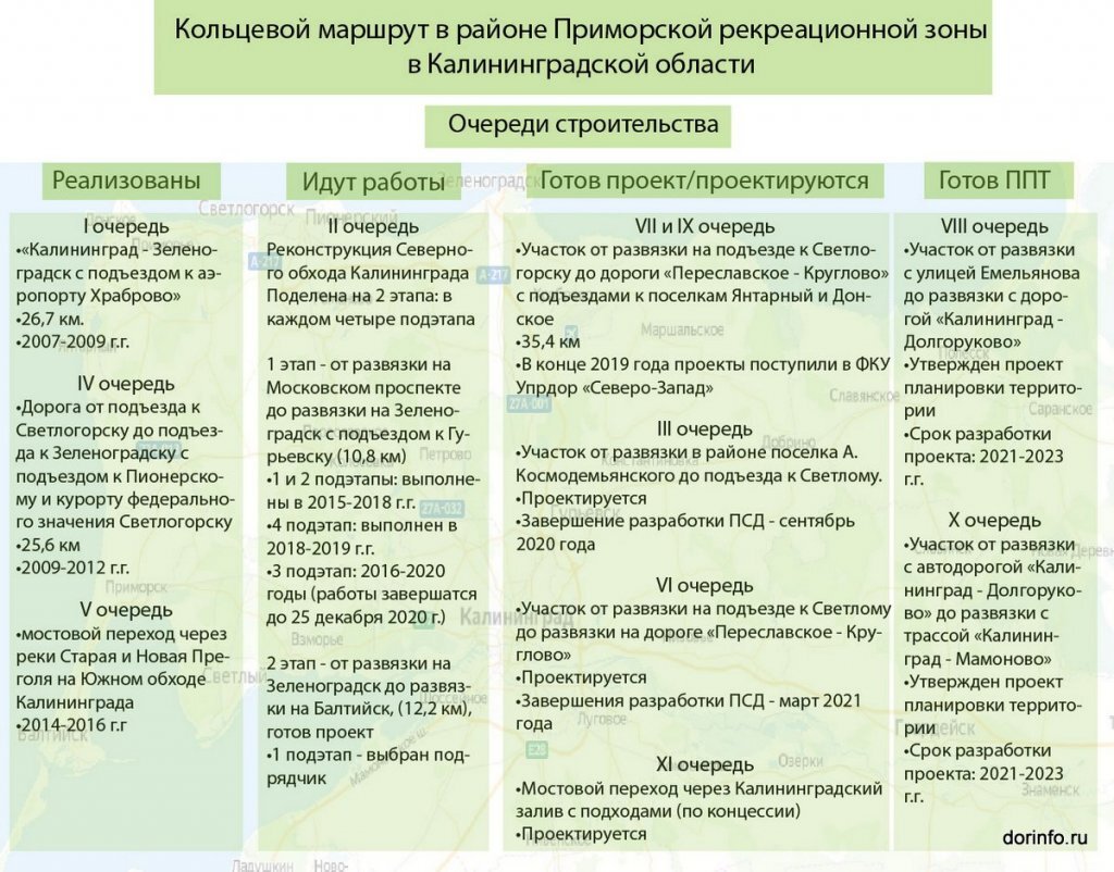 Строительство Кольцевого маршрута в районе Приморской рекреационной зоны является основной развития дорожной сети Калининградской области. Реализация проекта поделена на 11 очередей и включает в себя строительство новых трасс и реконструкцию Северного и Южного обходов Калининграда. Приступили к масштабной стройке в 2007 году, сейчас за плечами дорожников уже построено и реконструировано более 60 км, возведены развязки и мостовые сооружения. О том, что представляет собой Приморское кольцо в настоящее время, а также о плахах по дальнейшему строительству порталу «ДорИнфо» рассказали в пресс-службе правительства Калининградской области.