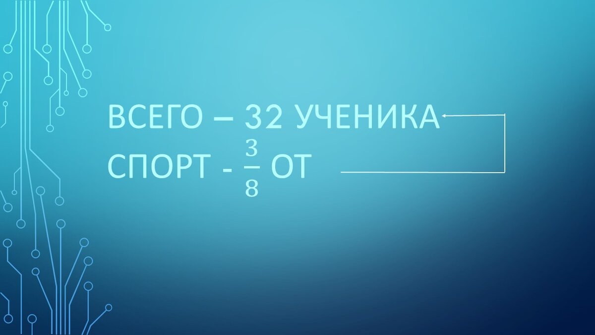 Все три вида задач начинают рассматривать в 5 классе. В 6 классе эти задачи только усложняют. Первый вид: нахождение дроби от числа и числа по его дроби Обе задачи будем рассматривать вместе, так как принцип понятен только так. Главное здесь научить находить число соответствующее понятию "Всего". В классе 32 ученика, при чем 3/8 всего класса занимаются лыжным спортом. Сколько учеников занято лыжным спортом? Всего - это 32 ученика. Это то число которое указывает на что-то целое. Второе число - это дробь. Подробнее об этом здесь. Значит это какая-то часть целого. Запишем условие. Важно акцентировать что необходимо указывать от чего именно эта часть. Это сыграет важную роль в более сложных задачах. Теперь перефразируем задачу. В классе 12 учеников занимаются лыжным спортом, и это составляет 3/8 всего класса. Сколько учеников в классе. Опять акцентируем внимание на понятии "Всего". В данной задаче мы не знаем сколько учеников в классе. Но при этом знаем, что лыжным спортом занимается к