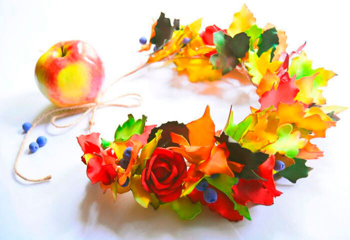 Вам понадобится: фоамиран толщиной 0,5 см (оранжевого, жёлтого, кремового, светло-зелёного, тёмно-зелёного и красного цвета), ножницы, зубочистка, фигурные ножницы, масляная краска осенних оттенков, губка, лист бумаги, утюг, флористическая проволока, линейка, супер клей, зажигалка, глина сиреневого цвета (для ягод черники) либо бусинки, тейп-лента, фольга, проволока толщиной минимум 2 мм и длинной 60 см, лента либо верёвочка, молд (фигура листка). Мастер-класс Комбинирование цветов: жёлтый листик фоамирана протонируйте светло-зелёной и коричневой краской. Также некоторые жёлтые листья протонируйте оранжевой, красной и светло зелёной краской. Красные листики протонируйте коричневым цветом, зелёные листики – бордовым, коричневым и тёмно-зелёным цветом. Разогрейте утюг на втором режиме, приложите лист на 2 секунды, снимите и прижмите к молду, чтобы получился оттиск листка. Этот процесс повторите со всеми листками. Учтите, это следует делать быстро и очень осторожно, так как фоамиран л