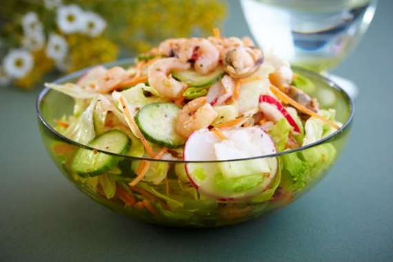 100 г свежих помидоров, 100 г свежих огурцов, 60 г редиса, 2 яйца, 40 г зеленого лука, 100 г сметаны, 30 г растительного масла, 10 г зелени укропа, 5-10 г горчицы, уксус, сахар, соль — по вкусу. Лук очистить, промыть и крупно нарезать. Помидоры, огурцы и редис обмыть, очистить и на- резать кружочками. Сваренные вкрутую яйца нашинковать тонкими ломтиками. В глубокой тарелке или салатнике растереть сметану, горчицу, сахар и соль. Помешивая, добавить к ним растительное масло и уксус. Получившимся coусом полить овощи, перемешать и посыпать укропом.
