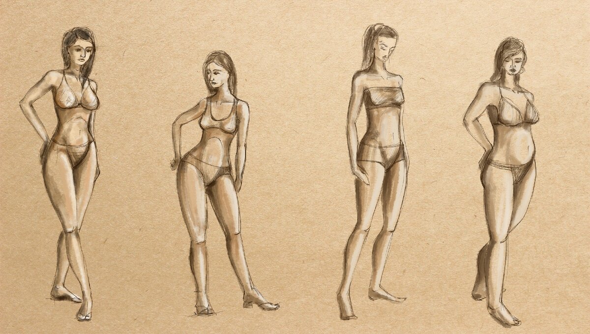 Рисовать девушек модельной внешности не так сложно, но как быть с изображением более реальных персонажей? Давайте разберем 4 самых распрастраненных типажа: Далее: Пошаговый разбор этапов рисования) #туториал ✔️ Шаг1. Наметить голову, изгиб позвоночника, плечевую и тазовую оси, длину рук и ног