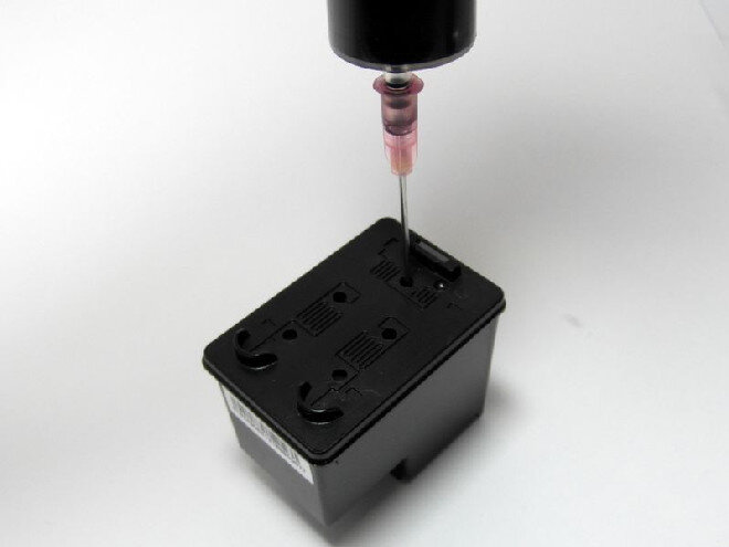 Для заправки помимо чернил следует обзавестись шприцом, который предварительно нужно наполнить приобретённой продукцией. Далее необходимо найти отверстие на картридже, диаметр, которого как раз должен подойти под толщину иглы шприца и снять с него наклейку (выбрасывать её не нужно). Теперь можно начинать заливку, которую следует производить достаточно медленно. Под заправляемый картридж при этом следует расстелить ненужные газеты, в противном случае пролитую краску придётся достаточно долго удалять с загрязнённой ею поверхности. После завершения процедуры нужно вернуть наклейку на место, иначе краска может потечь.