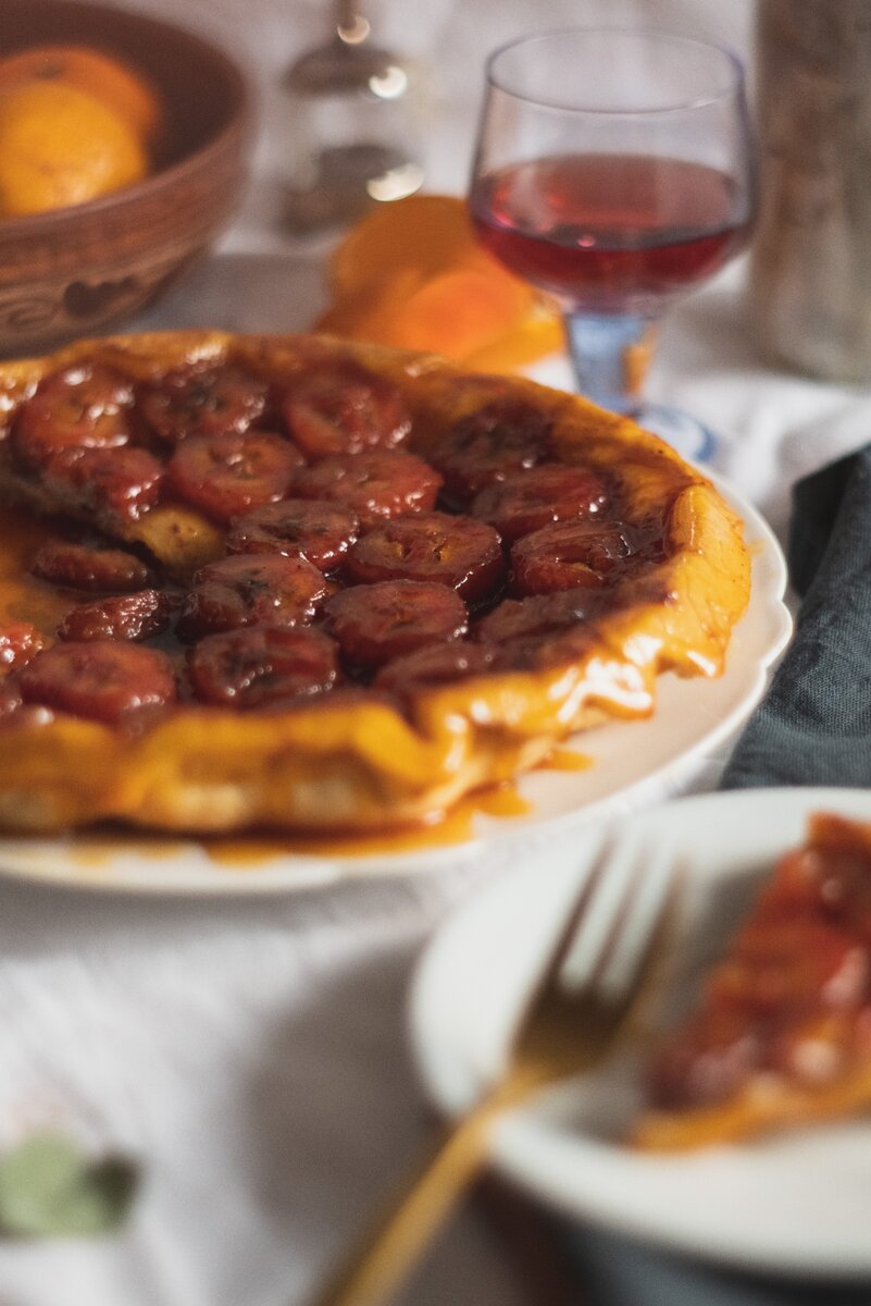 Ингредиенты (форма 26 см): Тесто: Мука 190 г. Сливочное масло 90 г. Сахар 1 ст.л. Щепотка соли Яичный желток 15 г. Ледяная вода 60 г. Начинка: Банан 3 шт. Сливочное масло 15 г. Сахар 150 г. Молотая корица 5 г. 1. Муку просеять, смешать с солью и сахаром. Добавить кубики холодного сливочного масла и руками перетереть в крошку. Ледяную воду смешать с яичным желтком и добавить в крошку. Замесить тесто, завернуть его в плёнку и убрать в холодильник на 30 минут. 2. В сухой сковороде растопить сливочное масло, добавить сахар. Начать аккуратно помешивать, когда сахар начнет плавиться и приобретать янтарный цвет. Как только весь сахар превратиться в карамель, убрать с огня, не допуская закипания. 3. Форму для выпечки (лучше брать не разъемную, чтобы карамель и сок банана не вытекали) смазать сливочным маслом, вылить горячую карамель. Работать нужно быстро, потому что карамель может застыть. 4. Бананы очистить, нарезать на кружочки толщиной 1,5 см. Выложить кружочки на карамель, посыпать ко