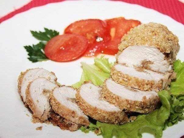 Запекаем куриные грудки Ингредиенты: - 4 куриных грудки (из расчёта одна - на порцию), - яйца - 2 шт. - черный молотый перец, - соль, толченные сухари и арахис. Приготовление: Филе поперчить и посолить - по вкусу. В одной тарелке взбить два яйца, в другой смешать арахис и сухари. Не обязательно использовать именно арахис - например, у меня сегодня смесь грецких и фисташек. Сначала филе обмакиваем в в яичный ″кляр″, затем аккуратно и тщательно панируем в сухарях и орехах. Форму смазываем маслом. Аккуратно подворачиваем филе в виде рулета. Духовку прогреваем до 230 градусов и запекаем в ней курицу 20 минут. Приятного жора :3