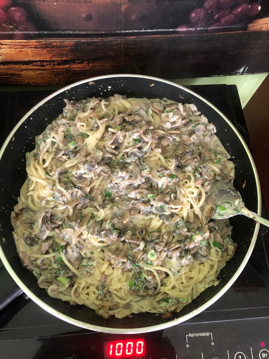 Вкуснейшее блюдо, которое к тому же, готовится просто и быстро. Если вы ценитель грибов, то это блюдо идеально подойдёт для вас. Ингредиенты: Приготовление: 1) Нарезать шампиньоны (полукольцами) и лук (лучше помельче) и обжарить на небольшом количестве подсолнечного масла до мягкости. Когда вода, образовавшаяся от грибов выкипит, добавляем немного сливочного масла — оно сделает грибы более ароматными. Посолить, поперчить. Не ждём пока грибы начнут поджариваться. 2) Далее делаем соус . В соус входят сливки 15%, мелко нарезанная зелень, соль, перец и небольшое количество орегано. Перемешиваем всё и добавляем к нашим грибам.(можно добавить сыр) 3) Спагетти варим в процессе приготовления грибов. 4) Дайте сливкам покипеть минутку и добавляйте отварные спагетти. Перемешайте хорошенько макароны с грибами и подавайте к столу. Украсить готовое блюдо можно зеленью. Приятного аппетита! Понравился рецепт? Не забудь поставить лайк и подписаться!