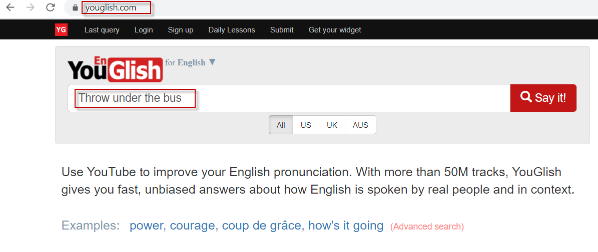 Сегодня я расскажу о сервисе, который очень полезно использовать всем, кто изучает английский язык. Допустим, вы знаете какую-то фразу на английском и хотели бы послушать, как она звучит в контексте, то есть в реальной речи. Сделать это очень просто с помощью сервиса Youglish.com. Давайте рассмотрим по шагам, как работает этот сервис. Заходим на сайт youglish.com и вбиваем какую-нибудь фразу, например: 'To throw under the bus'. Нажимаем на кнопку 'Say it!' Сервис показывает нам первое Ютуб-видео, в котором используется эта фраза. Нажимаем на кнопку 'Проиграть' и слушаем. Чтобы перейти к следующему видео с этой фразой, нажимаем на кнопку 'Далее'. С помощью этого сервиса вы можете искать видео для монтажа ваших видео-роликов и создания смешных нарезок. Кстати, знаете ли вы что значит фраза 'To throw under the bus' (бросить под автобус)? Узнать это вы можете на моём Телеграм-канале t.me/slackersenglish.