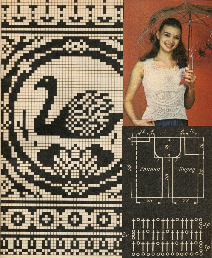 Добрый день, читатели. И сегодня мы продолжим наше ажурное хобби с журналом “Вязание” за 1986 год, автор Г.Л.Матвеева. Перед нами нарядная ажурная кофточка для летнего жаркого дня. Ее легкость и чарующий узор, завораживают и привлекают внимание. Размер миниатюрен - 44-46. Количество пряжи тоже - 200 г. И это белое хлопчатобумажное “кроше”. Вяжем крючком № 1,5, согласно выкройке и схемам. Вторая модель, это летняя маечка, по современному топ. Размер 46-48. Выкройки сайтов 600sovetov.ru, postila.ru Классическое сочетание черного и белого. Для работы берем спицы № 2,5, 200 г черной синтетической пряжи и немного белой - для бретелей и отделки. Бретели вяжем отдельной планкой и прикеттлевываем к топу. Белой нитью вышиваем бабочку, цветок или любой другой, понравившийся вам узор. Вязание чулочное. Небольшой коллаж фото. Костюмы и платья для лета. Вначале летний костюм с красивыми вставками из ажурных квадратов. Размер модели 46-48. Вяжем из 1000 г льняных нитей. Ажурные ленты для от