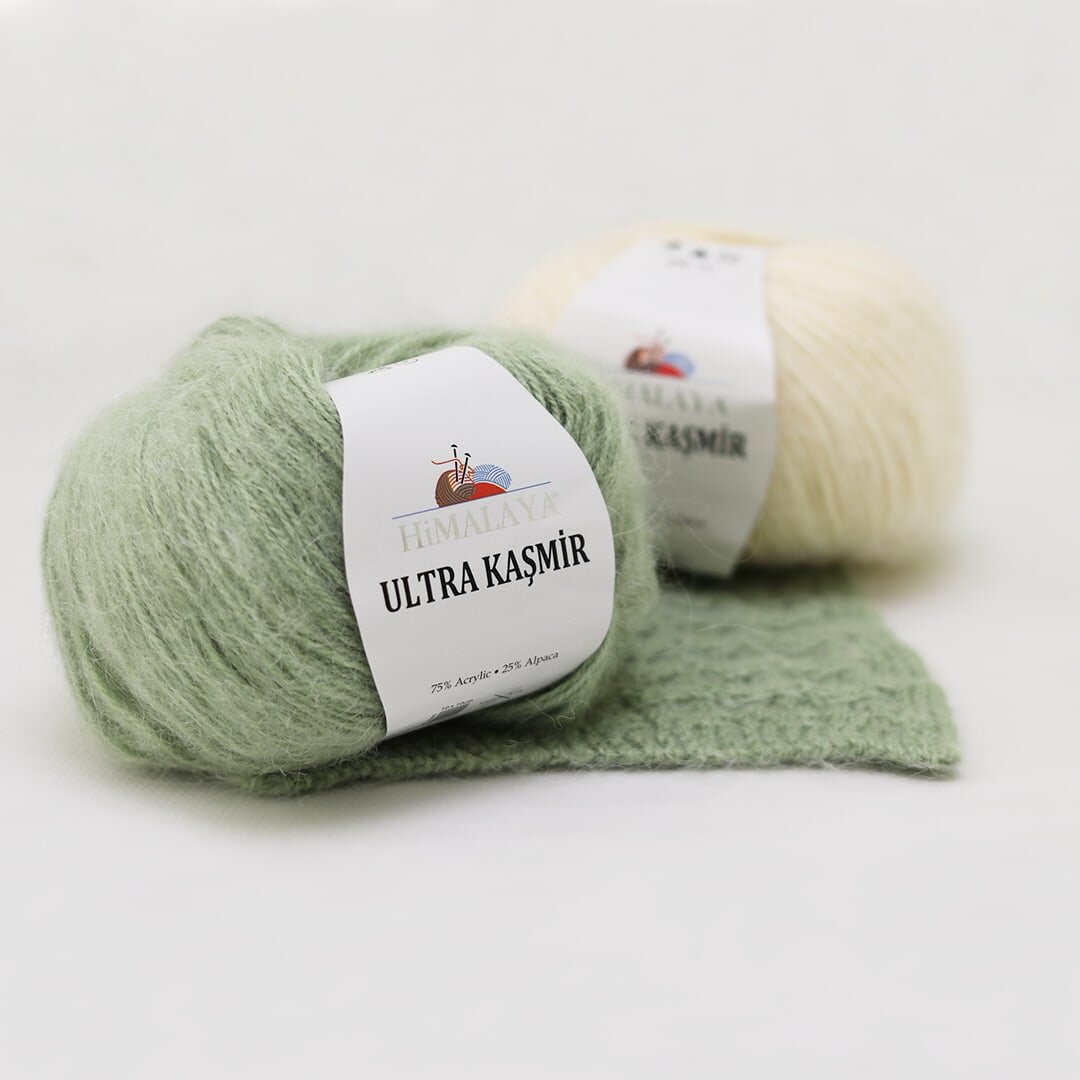 Пряжа с многообещающим названием. Внешний вид мотка Моточек круглый, воздушный, умещается на двух ладошках. Большую часть объема составляет пушистый ворс, высокий, похожий на мохер. Он мягкий, нежный, трогать его приятно. Строение нити Основа нити средней толщины, состоит из трех нитей. Но разъединить их практически невозможно. Они очень крепко сцеплены между собой ворсиком, несмотря на рыхлую скрутку. Вязаные образцы из Ultra Kasmir на спицах Так как основа нити не самая тонкая, в теории ее можно вязать плотно на мелком инструменте. Получается классическое зимнее изделие, мягкое и пушистое. Но роспуску тугое полотно поддается с трудом, а при вязании ворс может цепляться и затруднять захват нити. Поэтому проще вязать эту нить на крупном инструменте больше 5, как и рекомендует производитель. В рыхло связанном полотне узоры не теряют своей фактуры. Они также хорошо видны сквозь ворсик, который расправляется и ложится нежной дымкой. Изделие получается легким, воздушным, с прос