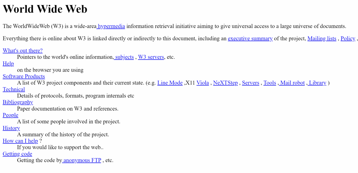 Этот сайт в одиночку сделал создатель гиперссылок и отец современного интернета Тим Бёрнерс-Ли, но сейчас такой страницей никого и не удивишь — на ней только текст и ссылки, чистый и незамутнённый HTML.