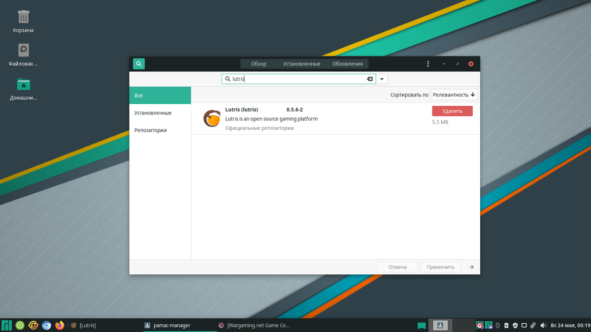 Всё описанное ниже - "костыли", и нет гарантии, что этот метод сработает на вашем Linux. Моё мнение - если хотите играть на ПК в 2020 году, используйте Windows 10. Для установки WOT в Linux нам нужна программа Lutris. В Manjaro она устанавливается просто, из менеджера установки программ. При установке будут предложены драйверы Vulkan API и эмулятор Wine, обязательно отмечаем их к установке. После установки Lutris нужно обязательно перезагрузить компьютер После установки перейдём на сайт Lutris.net в раздел Games - https://lutris.net/games Скачаем и установим Wargaming Game Center. В поле Search: пишем wargaming Жмём Enter или Apply filter Переходим в Wargaming Game Center Идём вниз, там будет русская версия Находим русскую версию, жмём Install Соглашаемся на предложение открыть ссылку в программе Lutris, дожидаемся установки и автоматической настройки Wine, соглашаемся установить компоненты Wine Откроется установщик Wargaming Game Center. Важно (!), перед установкой, перейти в пункт